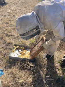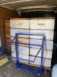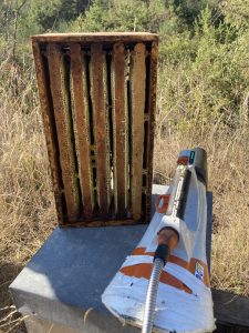 Récolte des hausses et haussettes remplies (plus ou moins) de miel de lavande, puis une fois le miel enlevé traitement bio contre le varroa (acarien parasite de l’abeille). C’est aussi le moment de de replir les abreuvoirs (indispensables en cette période de sécheresse) et enfin gratter le cire qui nous servira pour les futurs cadres. Travail en famille : ouf !!!